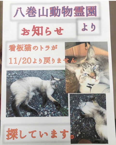 トラちゃんはこれまで一度も迷子になったり敷地から脱走したりはなかったそうです。
